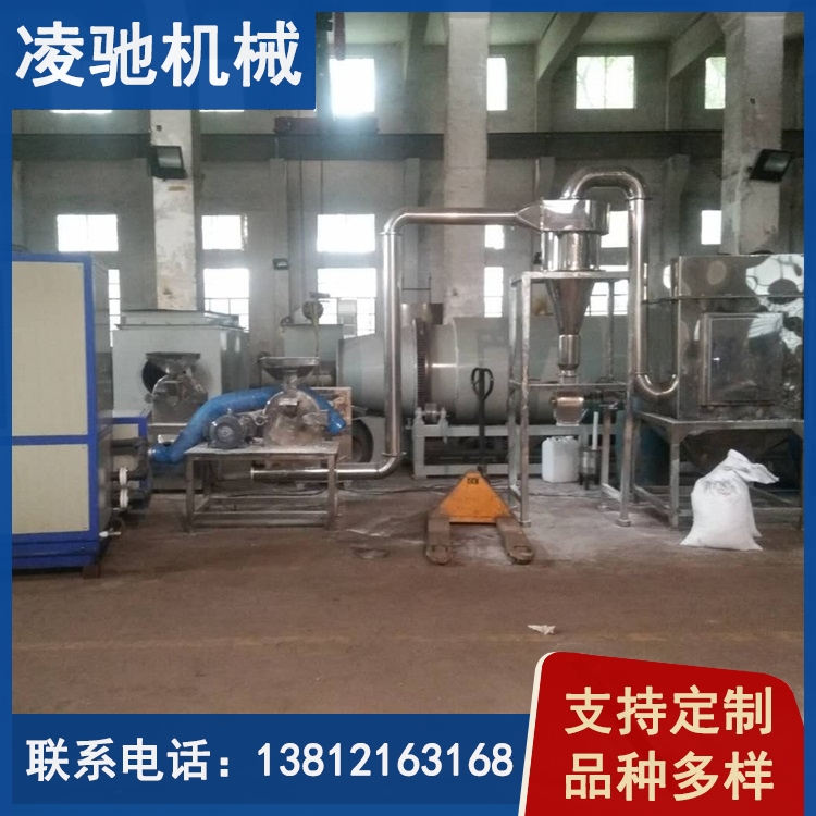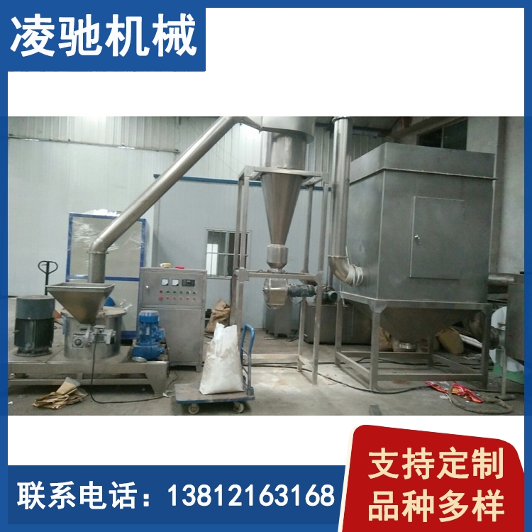 各型號超微低溫粉碎機組都含主機、 可調(diào)速的螺旋送料器、 旋風收集器加氣錘貢蕩裝置、 袋式除塵箱加氣流沖裝置、 引風電機造成負壓。 大功率引風電機不但可使輸送管道形成負壓, 使達到要求的細粉自動被風力吸入管道, 而且巨大的風是還帶走了粉碎腔內(nèi)不斷產(chǎn)生的熱量, 同時對粉碎機組的管道起到一個強有力的清理效果。旋風收集器出料口加裝了關風機, 出粉口無粉塵飛揚, 達到了清潔、 環(huán)保、 節(jié)約的效果。
