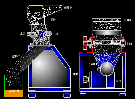 物料由進料斗進入粉碎室,利用旋轉刀與固定刀沖擊、剪切而獲得粉碎,經(jīng)旋轉離心力的作用,物料自動流向出口處。該機按“GMP”要求設計,整機采用不銹鋼材料制造,結構簡單,清洗方便、噪音低、目前是粗粉碎中較理想的設備。