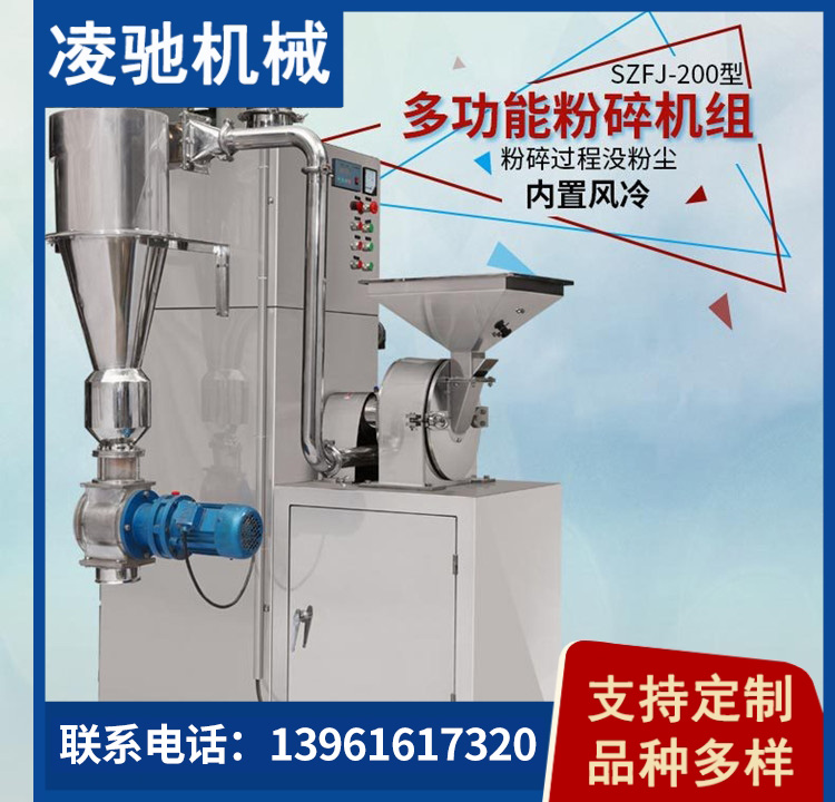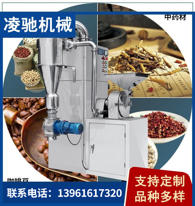 中草藥粉碎機動轉時,電機帶動主軸及渦輪高速旋轉。渦輪與篩網圈上的磨塊組成破碎、研磨副,當物料從加料斗中進入機腔內,物料在渦輪的旋轉氣流中緊密地摩擦和強烈地沖擊到渦輪的葉片內側上,并在葉片與磨塊之間的縫隙中再次研磨。在粉碎物料的同時,渦輪吸入大量空氣,這些氣流起到了冷卻機器、研磨物料及傳送細料的作用。物料粉碎的細度取決于物料的性質和篩網的尺寸,以及物料和空氣的通過量。中草藥粉碎機的軸承部件裝有特制的迷宮密封,可以有效地阻止粉塵進入軸承腔,從而延長了軸承的使用壽命。機門內裝有硅橡膠密封圈,無粉塵泄露而污染操作環境。中藥材機按GMP標準設計,生產過程無粉塵飛揚。